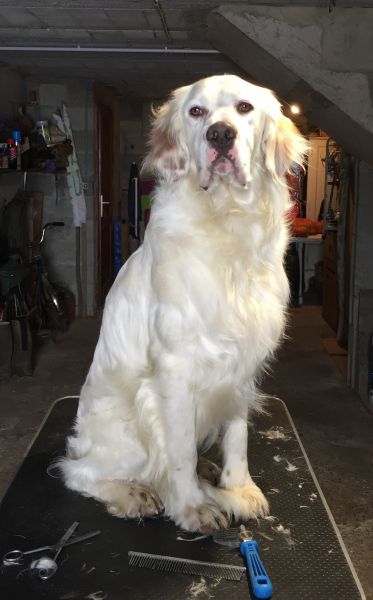 Salon de toilettage pour chiens Saint-Priest Moïse - Setter-Anglais Mâle Toilettage, brushing Avant shampoing, démêlage, toilettage Après toilettage :