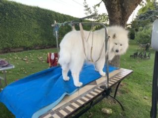 Toilettage à votre domicile Voiron Lasco - Samoyède mâle Toilettage, brushing Avant shampoing, démêlage et toilettage Après toilettage :